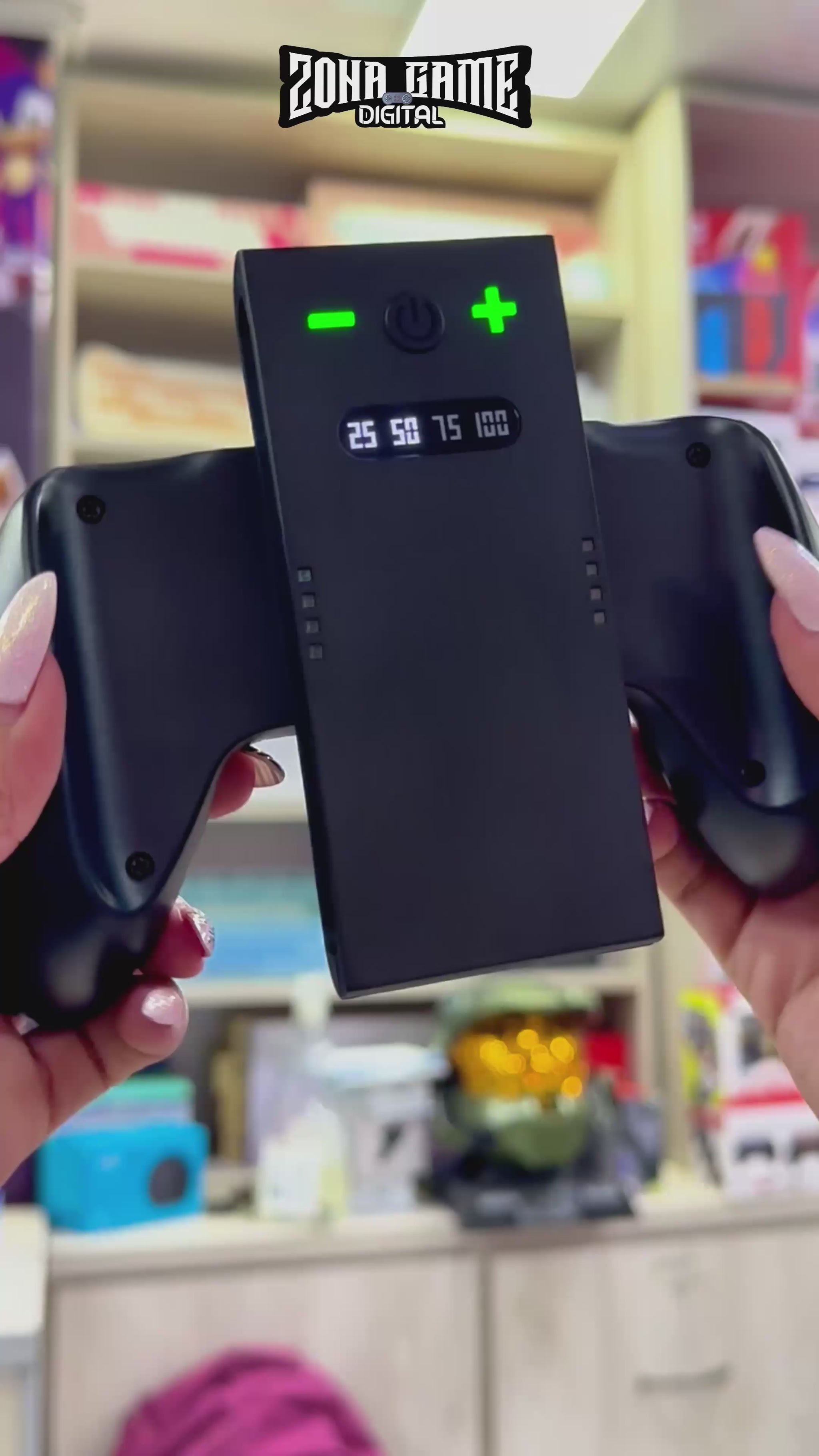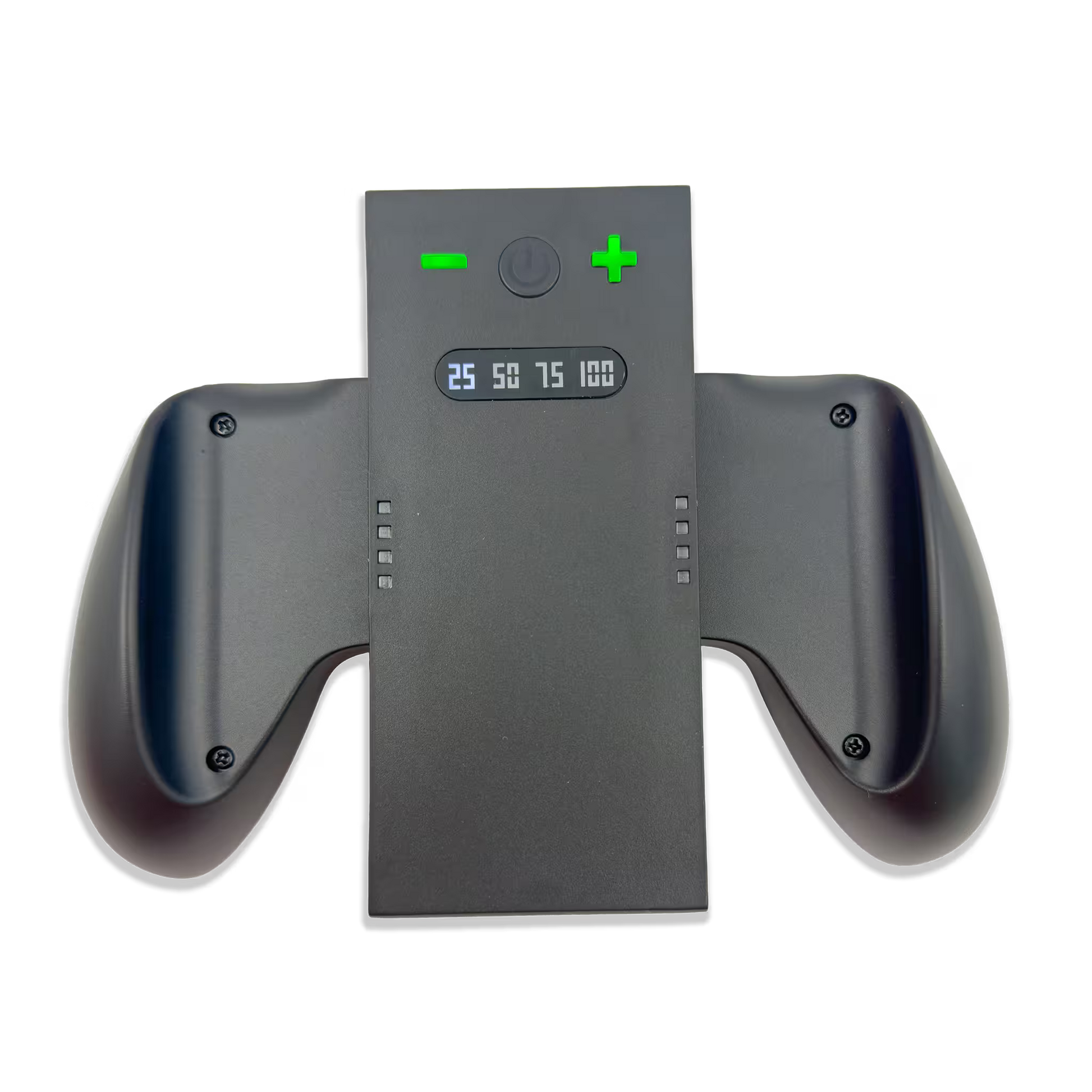 Pantalla De Nivel De Batería: Cuenta con un panel frontal que muestra el estado de carga actual mediante indicadores numéricos: 25, 50, 75 y 100 por ciento.