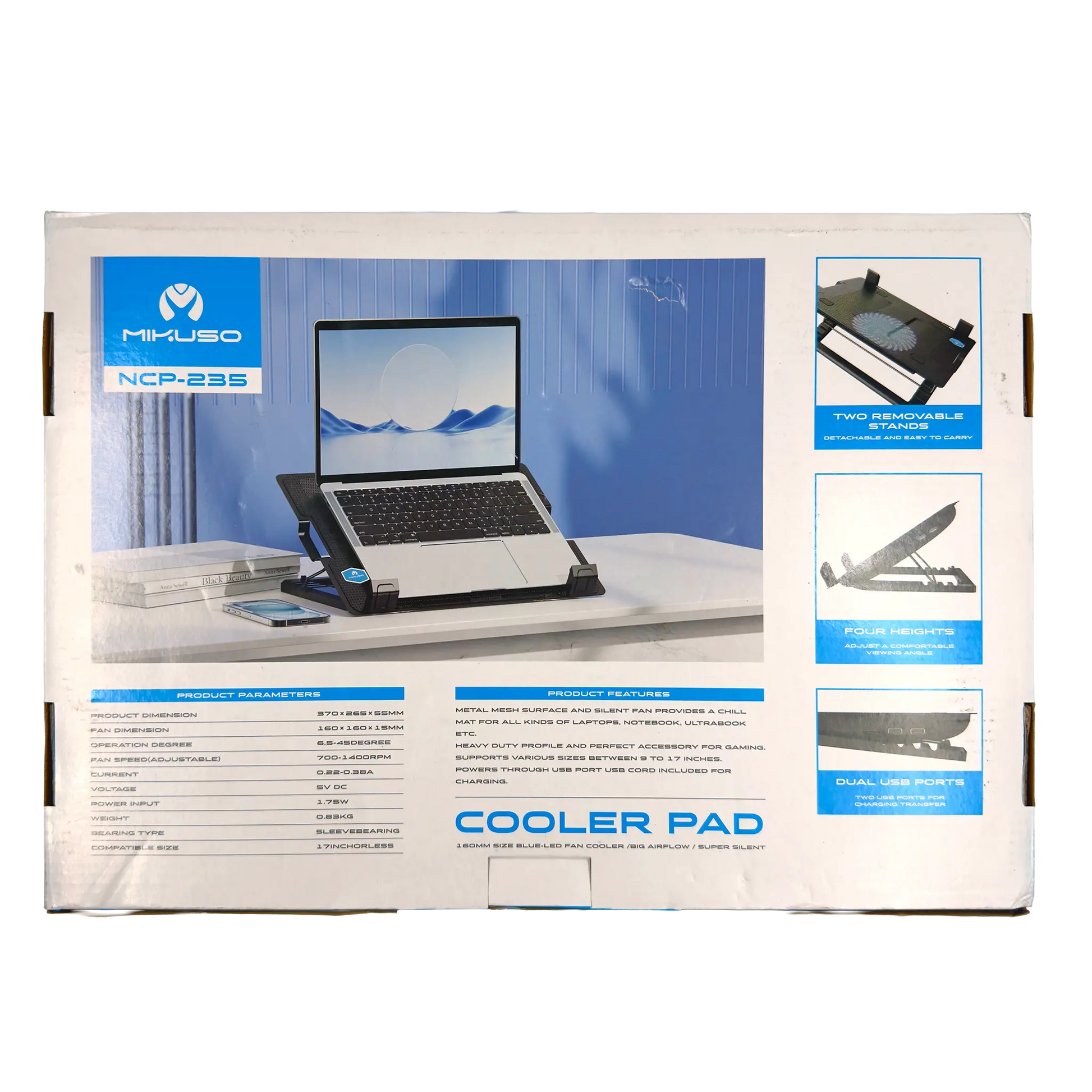 - Ventilador Único de Alto Rendimiento: Cuenta con un ventilador de 160 mm que proporciona un alto volumen y presión de aire, garantizando un enfriamiento efectivo para el portátil.