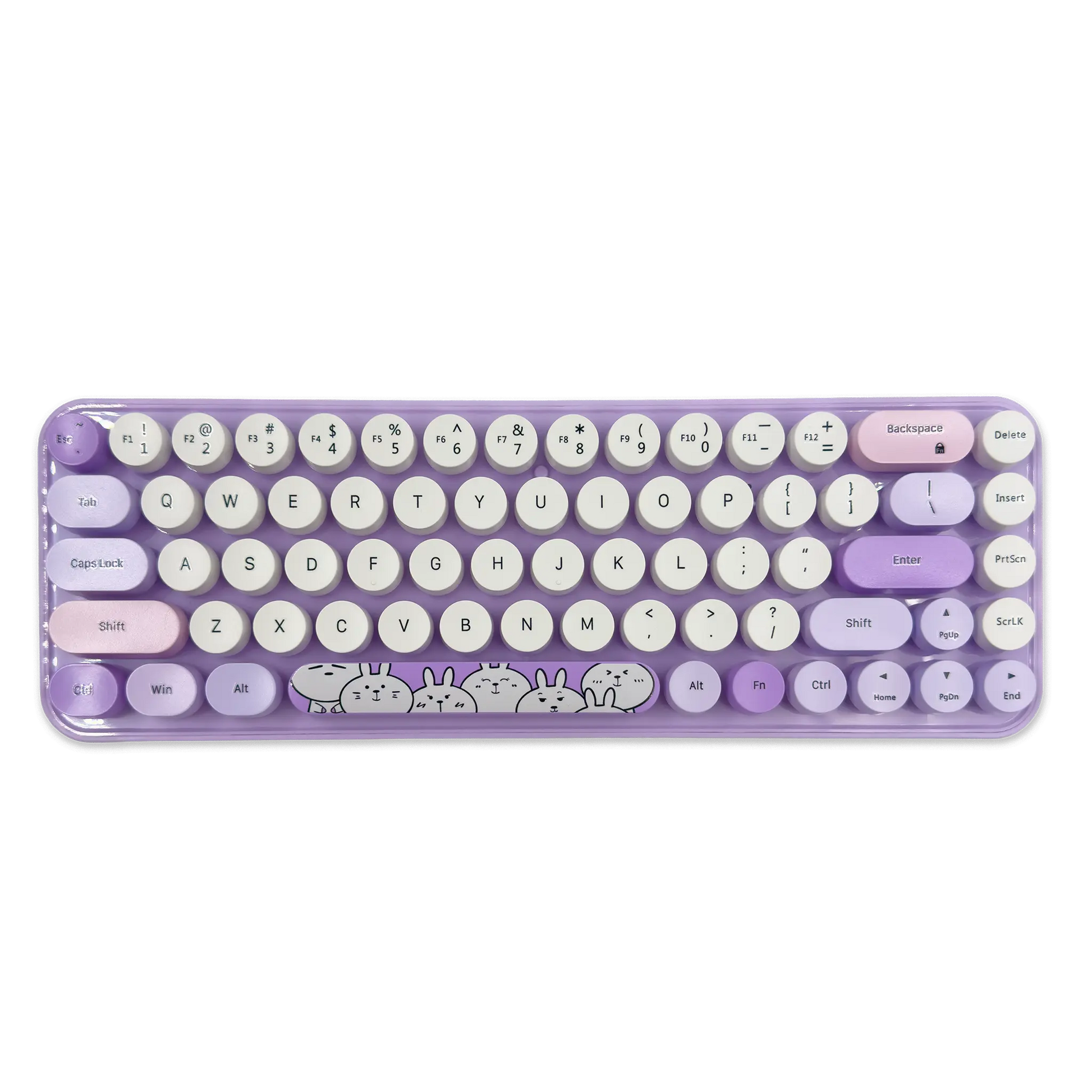 Su diseño compacto de 84 teclas con Round Keycaps (teclas redondas) tipo máquina de escribir, se complementa con un ratón silencioso con diseño Kawaii (animado). Disponible en Azul, Rosado y Morado, este combo inalámbrico de 2.4 G transformará tu espacio de trabajo.