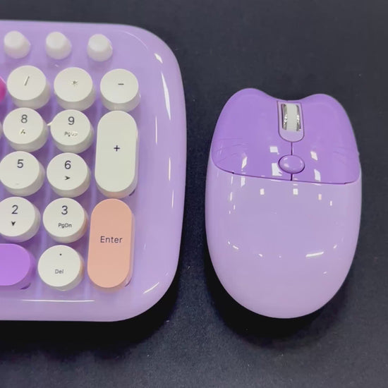 El combo retro más completo y silencioso del mercado — teclado full-size de 104 teclas con diseño de teclas redondas estilo máquina de escribir, pulsación suave y de bajo ruido, y mouse inalámbrico a juego en morado. Ideal para oficinas, bibliotecas y cualquier entorno donde se necesite discreción sin sacrificar estilo.
