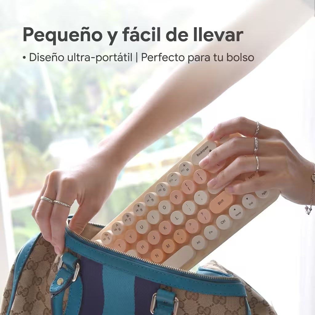 Sus icónicas teclas redondas de diseño retro y su acabado en tono habano — un beige dorado cálido y atemporal — lo convierten en el accesorio más elegante y minimalista para cualquier escritorio. Con 68 teclas compactas, conexión inalámbrica 2.4G y un solo receptor USB para ambos dispositivos, es la solución todo-en-uno para trabajar, estudiar y navegar con estilo neutro y sofisticado.