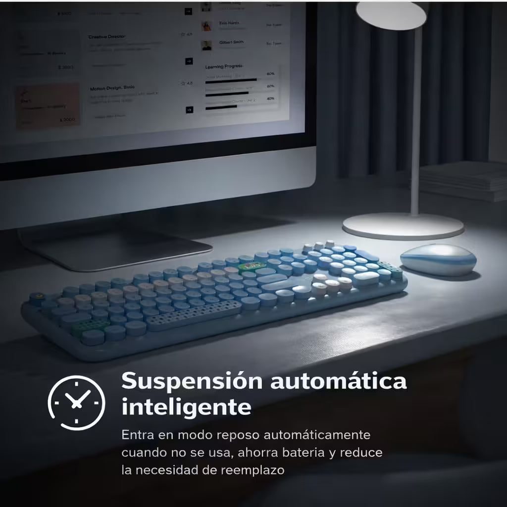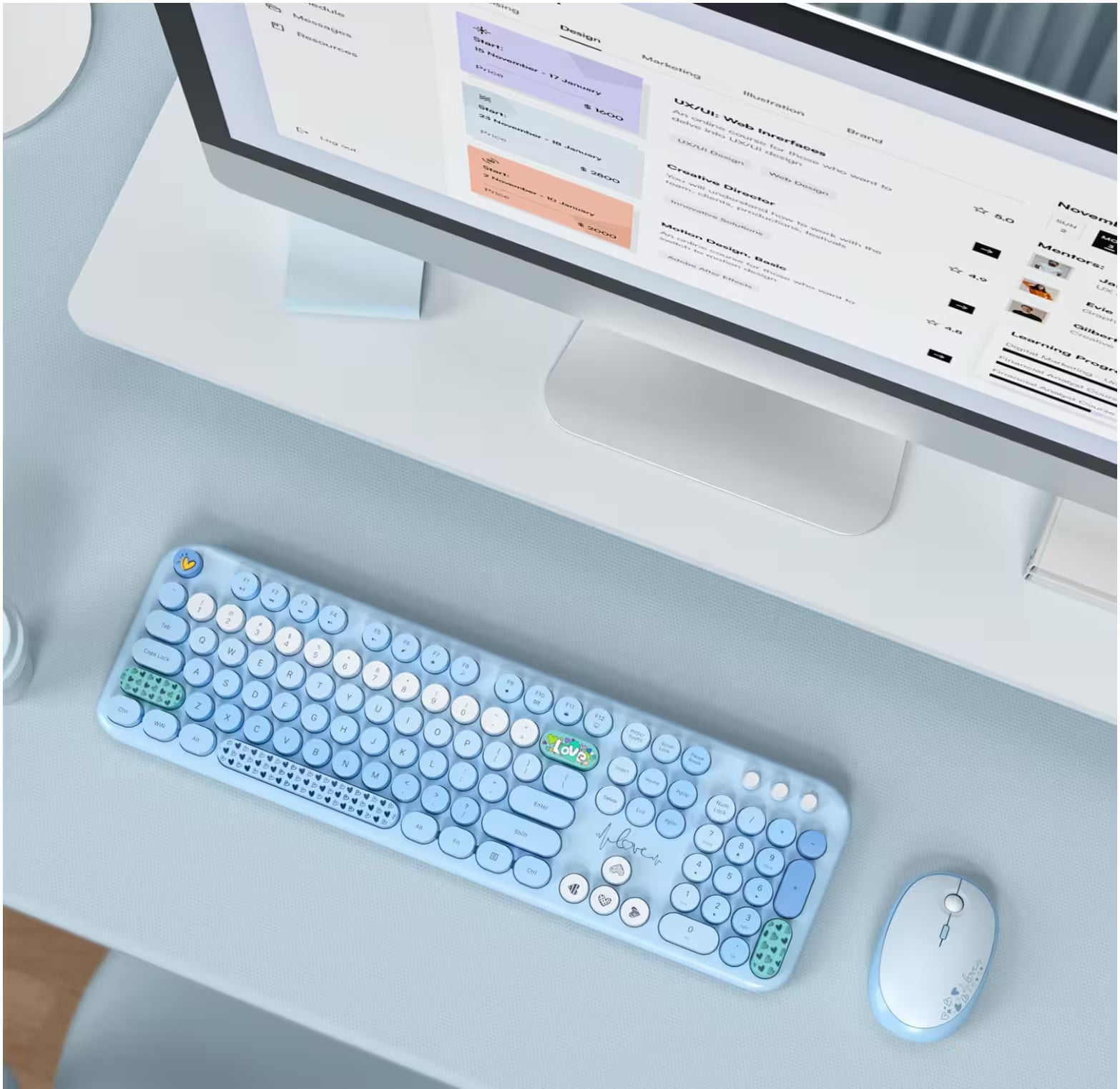 El único combo retro azul con teclado Full-Size y teclado numérico — máxima productividad con un toque fresco y vibrante. Teclas redondas Lovely en azul, mouse 4 botones con DPI ajustable y 1 solo receptor USB para ambos. Plug & Play.
