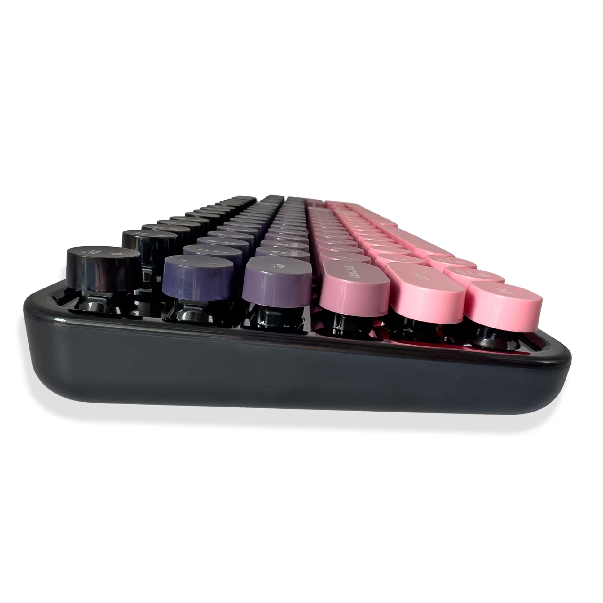 - Estética Retro-Chic: Teclas circulares con sistema "Pop" en una elegante degradación de grises que le da un toque profesional y moderno a tu espacio