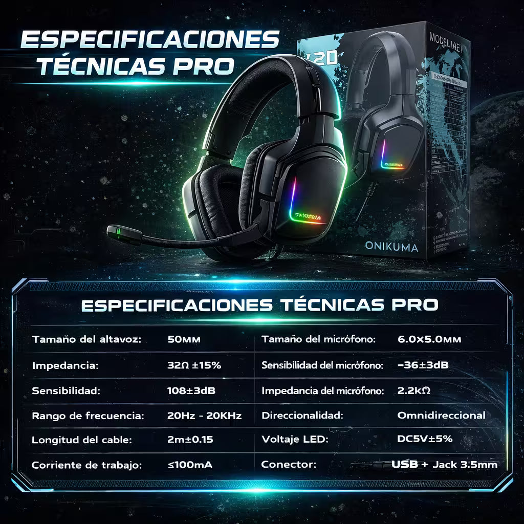 Diadema Gamer ONIKUMA K20 RGB - Audio Precisión 40mm Cancelación Ruido