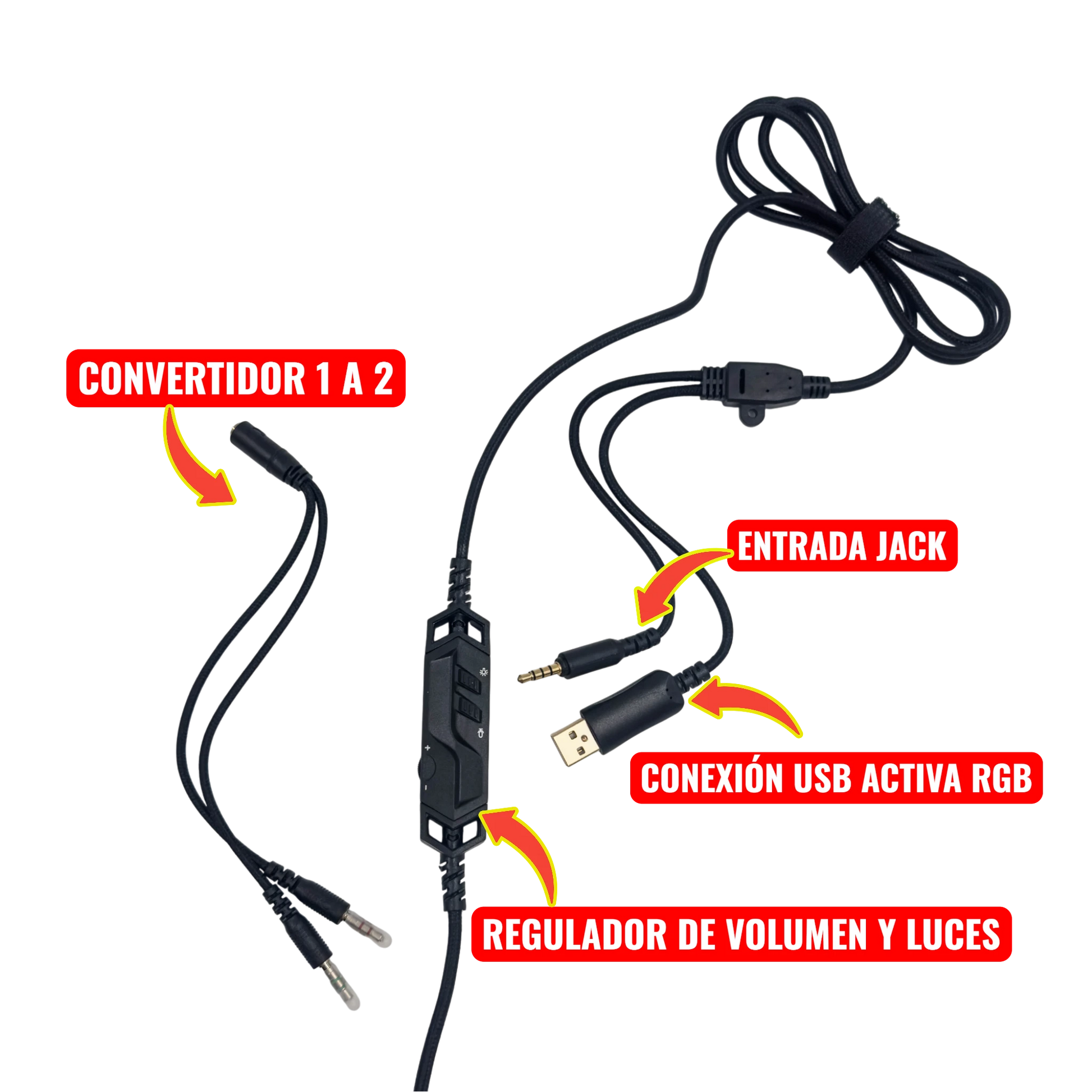 Conectores: Enchufe de 3,5 mm + USB (para las luces)