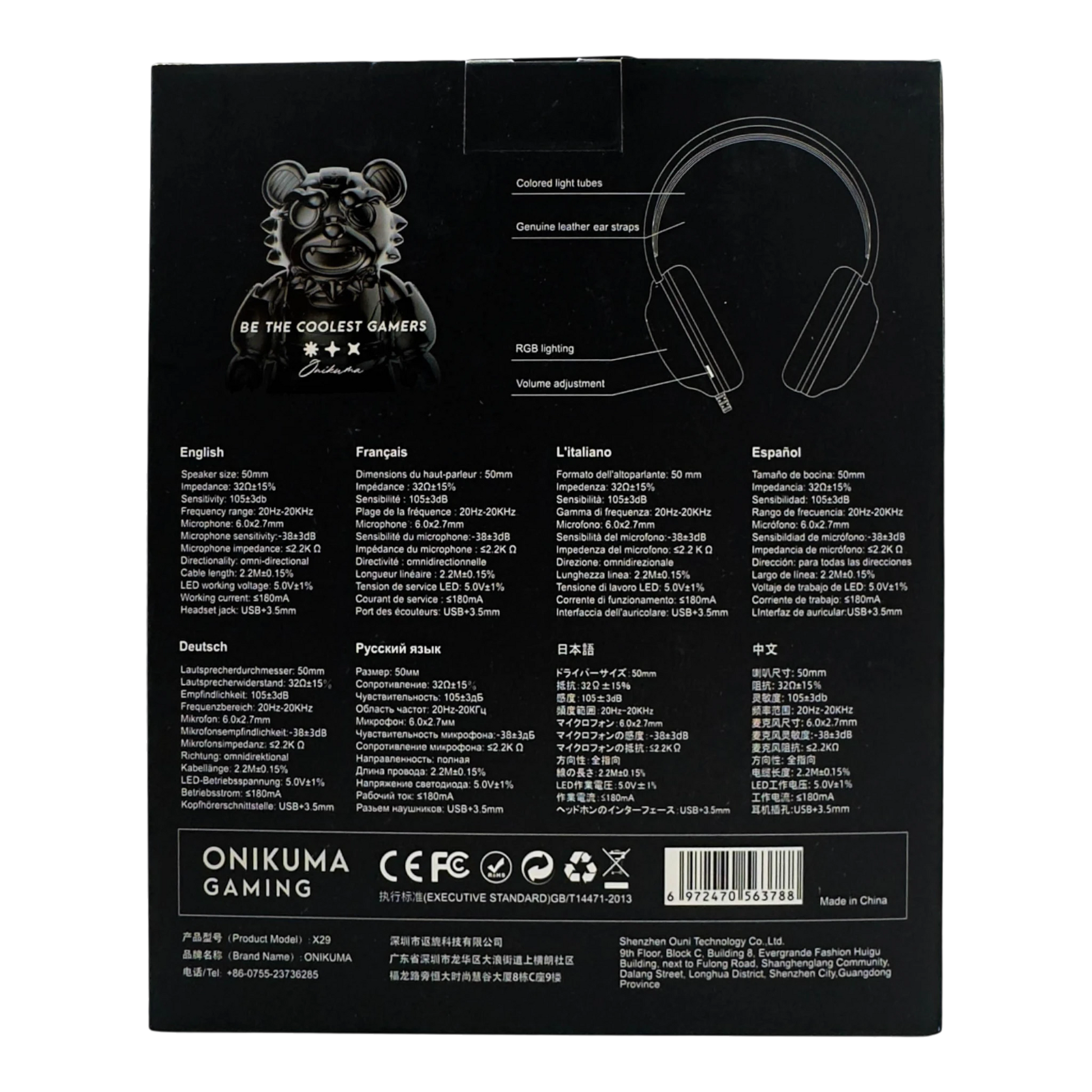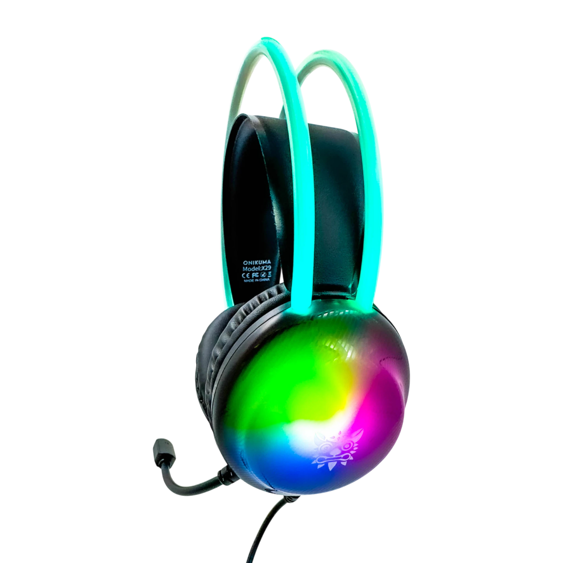 La diadema ONIKUMA X29 es compatible con una amplia variedad de plataformas, ya que se conecta mediante una interfaz dual de 3.5 mm (para audio y micrófono) y USB (para la alimentación de las luces RGB).