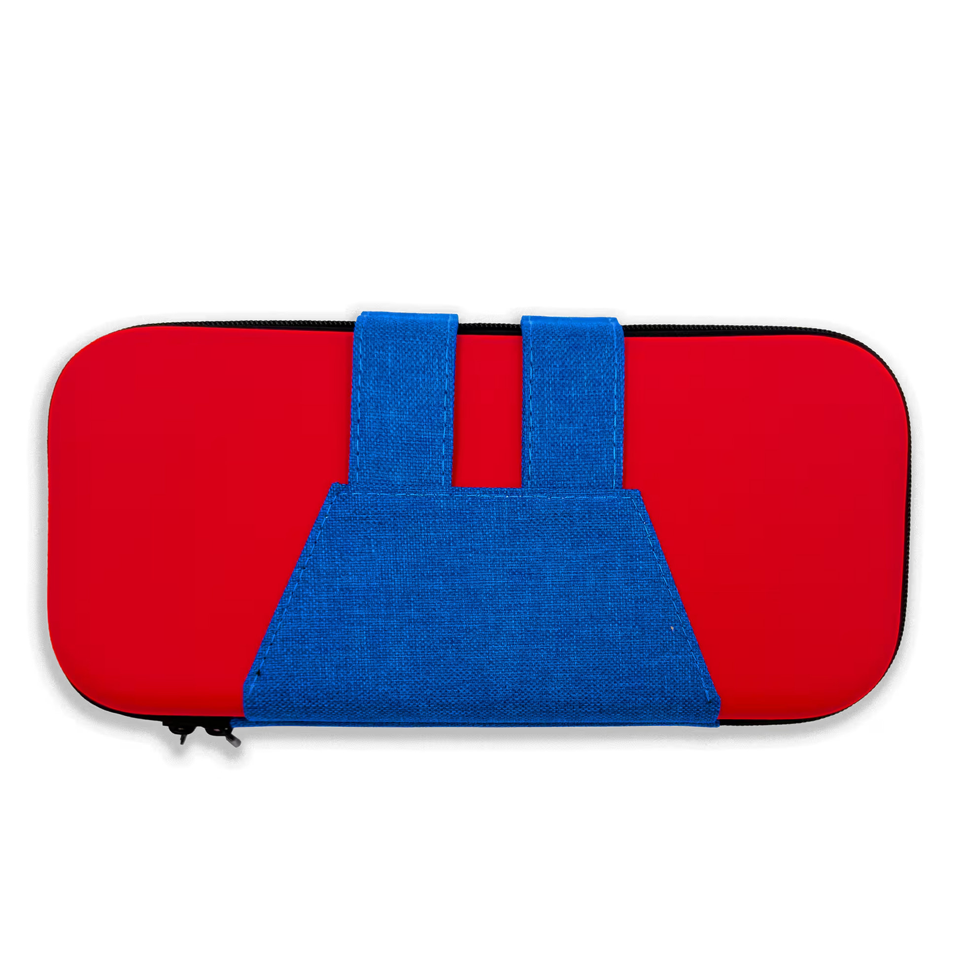Detalle Temático: La parte frontal del estuche presenta un diseño de overol de tela azul con botones amarillos, replicando el atuendo clásico de los plomeros más famosos del mundo.