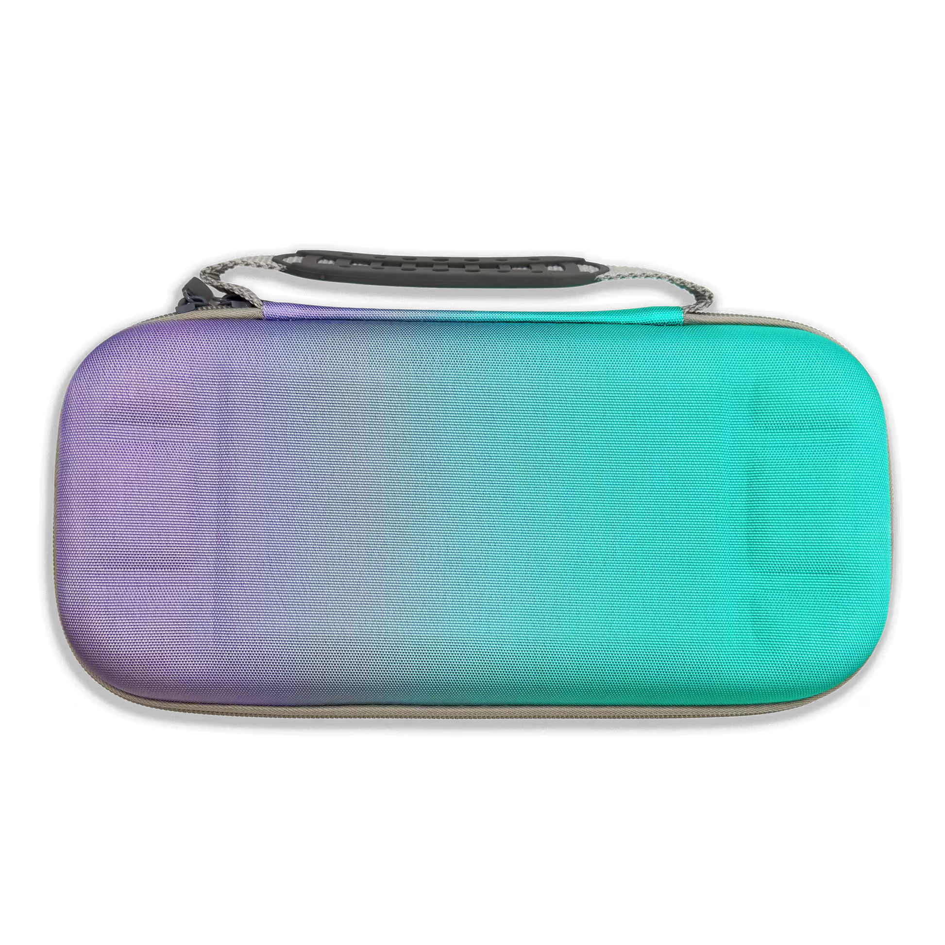 Este estuche de transporte combina una carcasa externa resistente con un diseño gradiente bicolor (Lila a Menta) que te hará destacar.