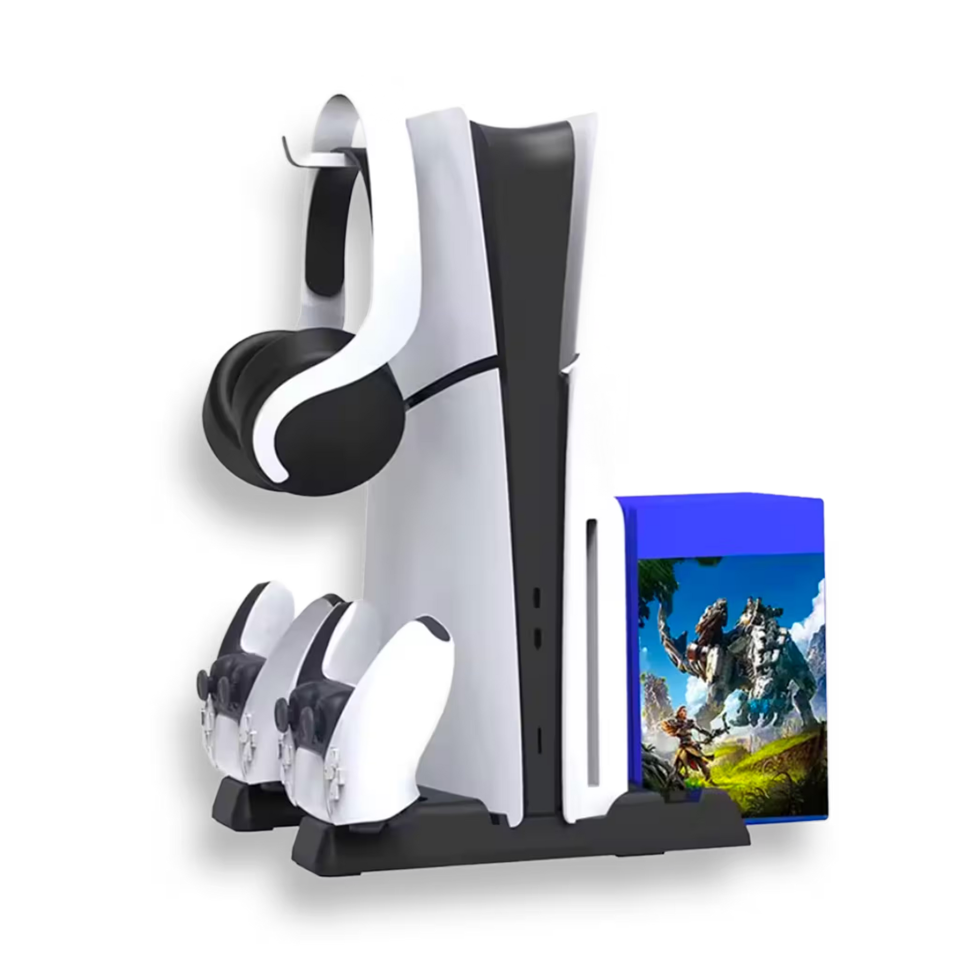 - Almacenamiento y Organización: La base incluye una ranura de almacenamiento con capacidad para hasta 11 discos de juego. También cuenta con ganchos colgantes desmontables para auriculares o controladores.